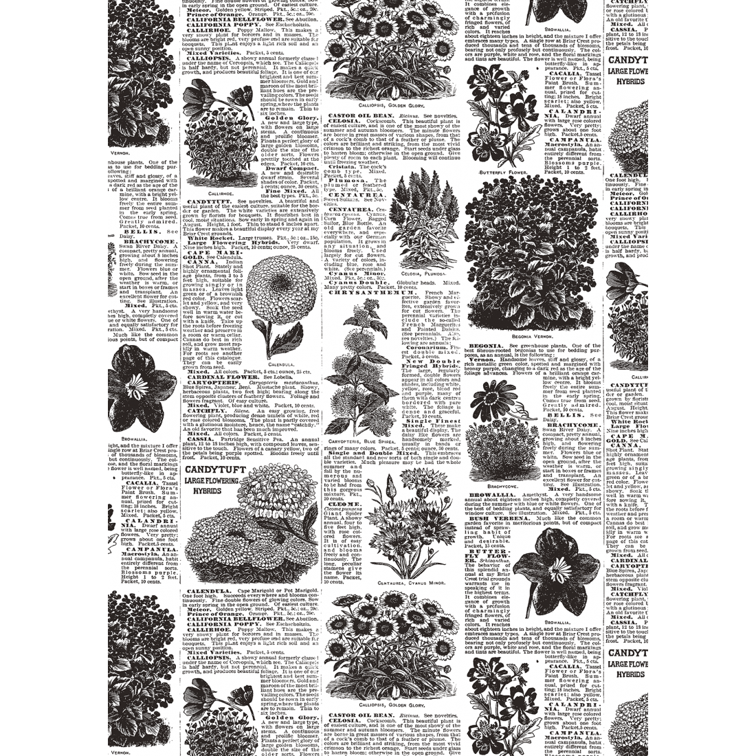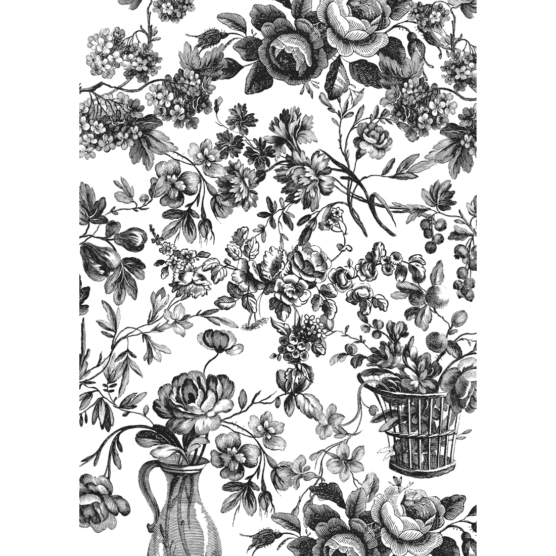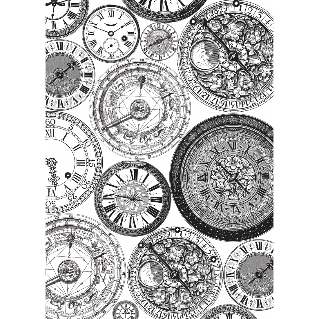 4 sheets of paper of low grammage ideal for works of découpage, collage, journal etc. 4 different designs 21x29,7 printed in black.